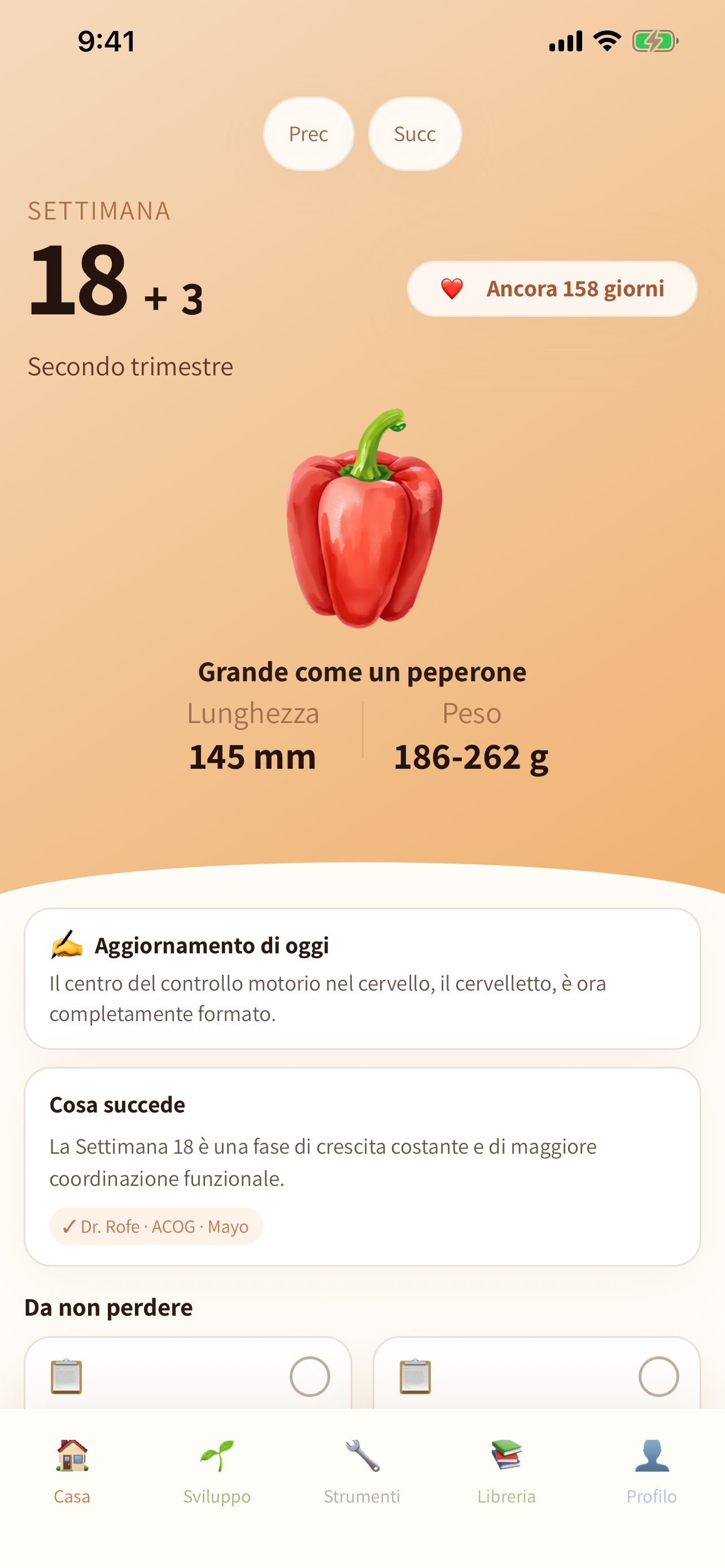 Contenuto medico approfondito per tutte le 40 settimane di gravidanza. Adattato per Italia, Israele, UK e USA.